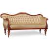 the button-upholstered back with a serpentine back rail over a fixed cushion seat flanked by high scrolling arms with leaf carved scrolled facings, raised on turned and tapered legs ending in brass caps and ceramic castors; covered in pale yellow upholstery