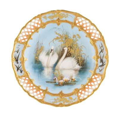 the border moulded with four pierced trellis panels shaded in coral and ivory, interspersed with panels of swallows and raised gilt floral decoration; centrally painted with two swans swimming amongst reeds and grasses, some picked out in raised gilt, with water lilies blooming the foreground, on a blue ground, signed C. H. C Baldwyn; puce factory mark, Rd. No. 276277