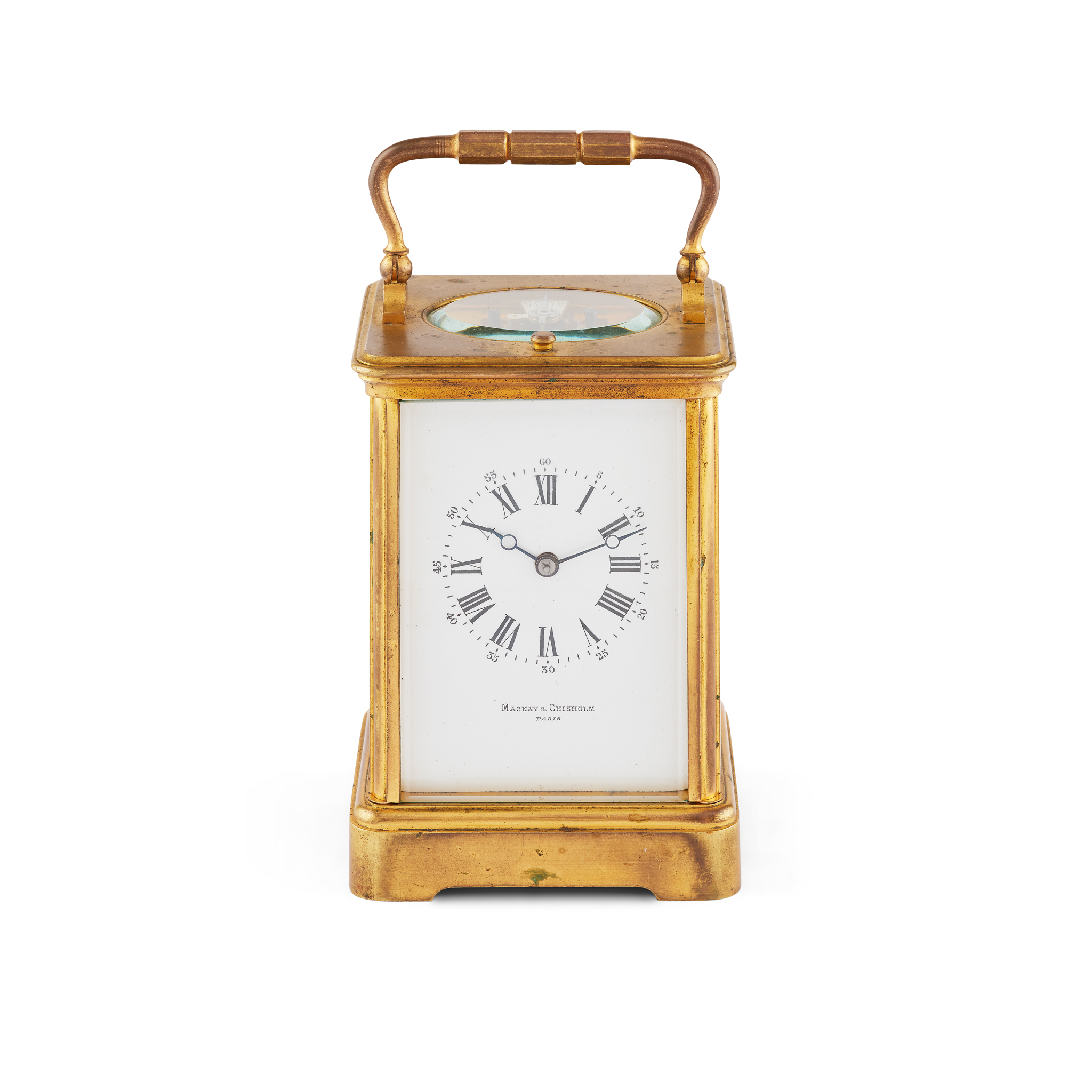 the white enamel dial with Roman numerals and Arabic five minute markers, signed ‘Mackay & Chisholm, Paris’, the gorge case with push button repeat to the top, the brass twin train movement with silvered platform level escapement, with a fitted case