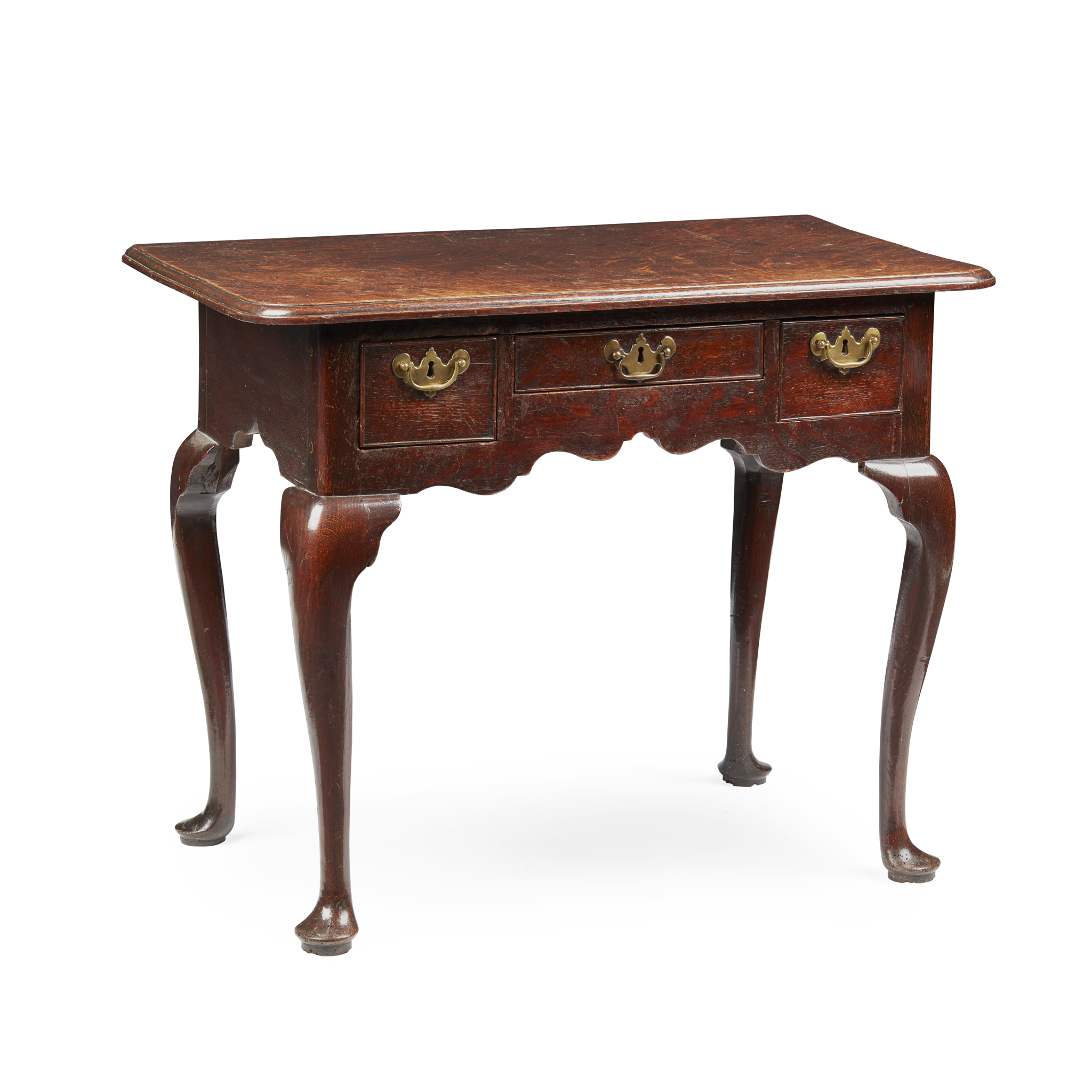 the two board top with a moulded edge above three frieze drawers over a shaped apron, raised on cabriole legs ending in pad feet