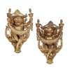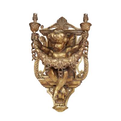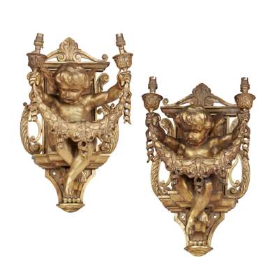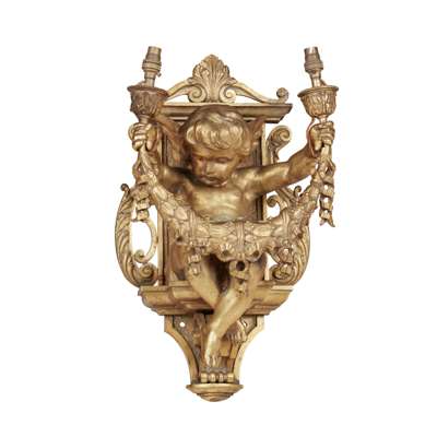 modelled as a putto seated on a ledge holding twin candle nozzles joined by a laurel garland, against a lyre form architectural backplate, wired for electricity (2)