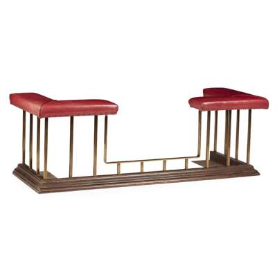 with two L shaped seat pads covered in red leather, raised on square spindle supports on a moulded base