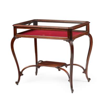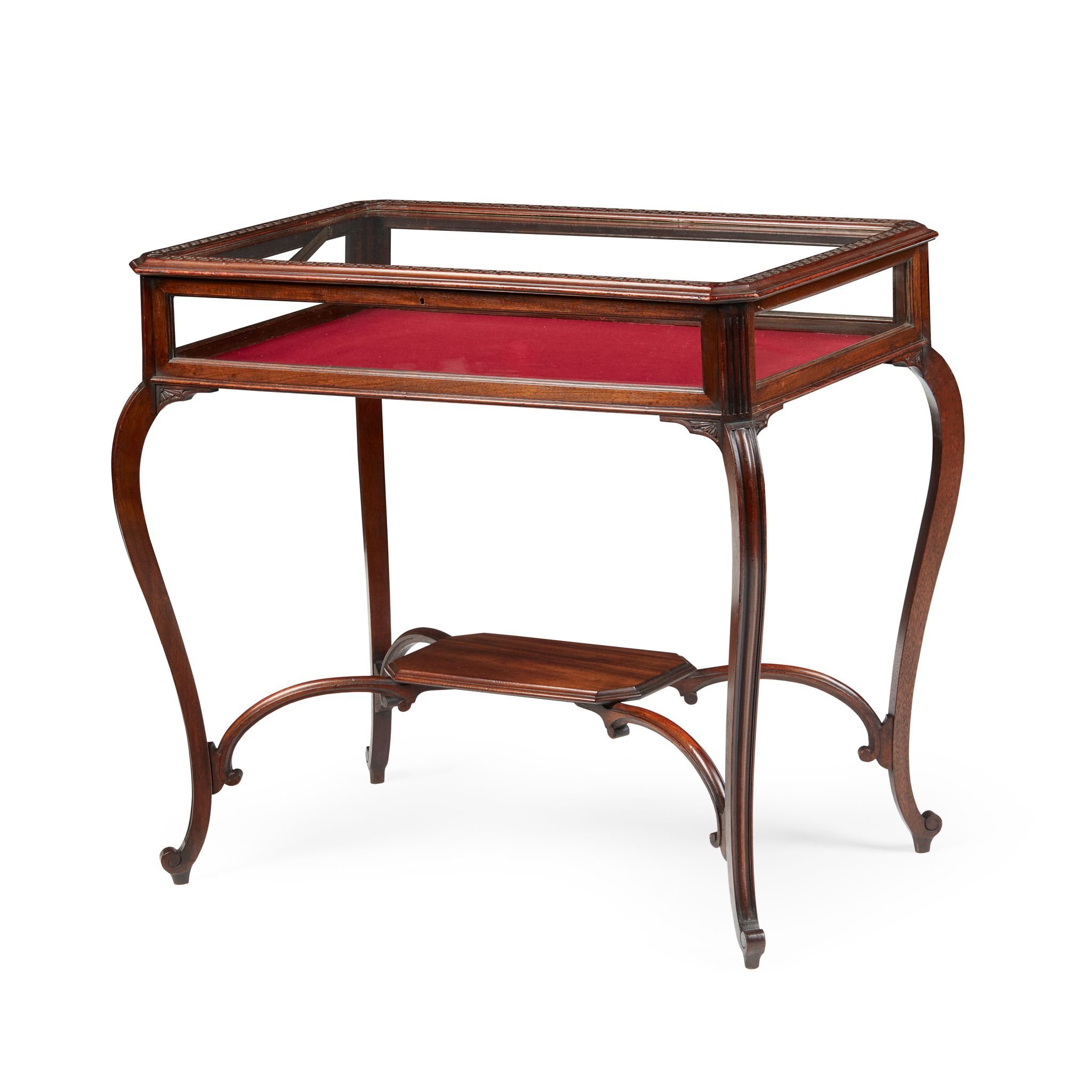 the rectangular glazed and hinged top within a mahogany frame with canted corners and blind-fret carving, above glazed side panels and supported on fluted cabriole legs ending in scrolled toes and united by C scroll stretchers joined by an undertier