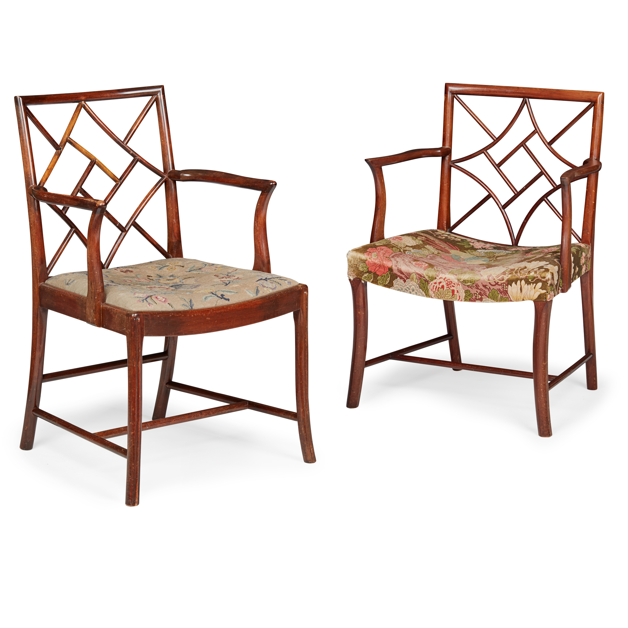 with lattice backs and scroll arms, one with a drop-in seat pad, the with a stuff-over seat, on slightly splayed legs joined by stretchers (2)