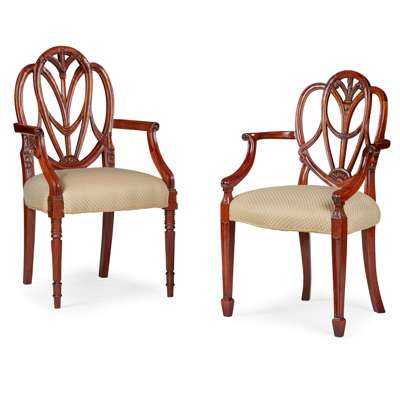 the cartouche shaped backs pierced and carved with Prince-of-Wales plumes and swags, above wide stuff-over seats, raised on moulded square tapering legs ending in spade feet, comprising eight side chairs, an armchair, and another armchair of matching design (10)