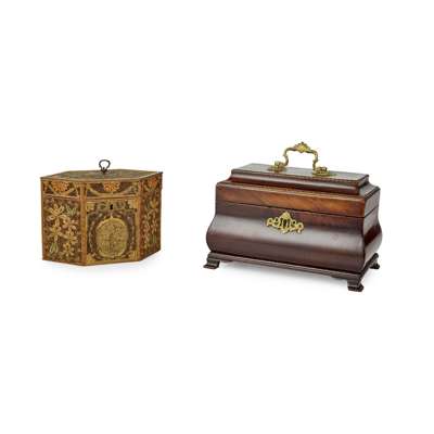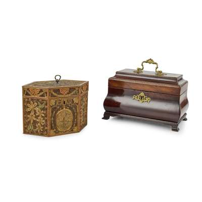 the first a mahogany caddy of rectangular ogee form with brass swing handle on bracket feet, later converted into a ink stand with glass wells; the other an hexagonal satinwood veneered rolled paper caddy, the floral panels in coloured and gilt paper (2)