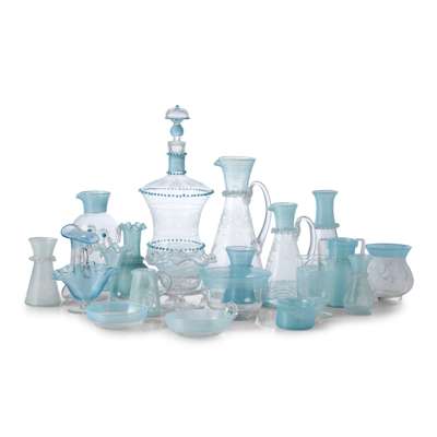 including examples by Hodgetts, Richardson and Pargeter of the Wordsley Flint Glasswork and examples from the Red House Glassworks, Wordsley; comprising vases, jugs and bowls of various forms, two round shallow cups, a basket, and a girandole with mirror plate back, with some engraved examples, including two graduated jugs of tapering form, engraved with flowers, foliage and insects, a carafe with similar decoration, and a decanter and stopper of unusual urn shaped form, raised on a circular foot, engraved with bands of flowers (22)