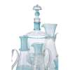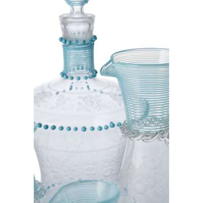 the larger engraved jug 25cm high, the smaller engraved jug 17.8cm high, the carafe 19cm high, decanter and stopper 35cm high