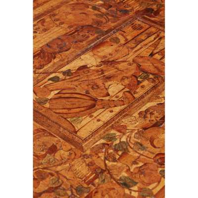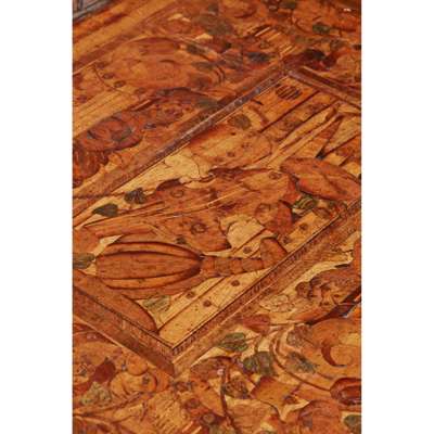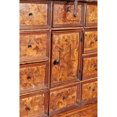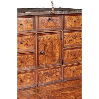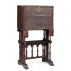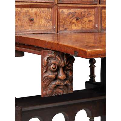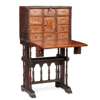 with a hinged top and fall front opening to reveal an arrangement of drawers around a central cupboard, all with geometric landscapes, the fall with a musical trophy, on a later stand with slides faced with green man masks, on a spindle turned trestle base