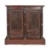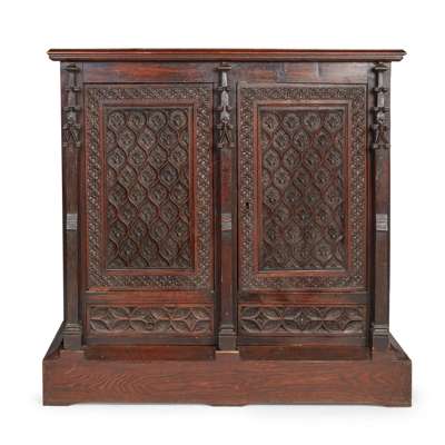 with a pair of panel doors blind point carved in the Gothic manner, flanked by square columns capped with crocketed spires, over two short drawers and a plinth base
