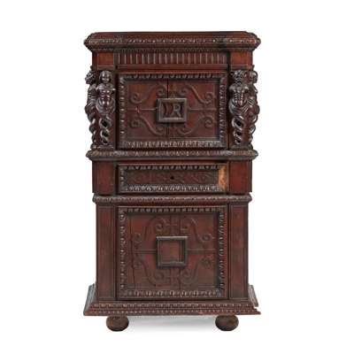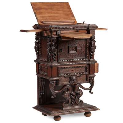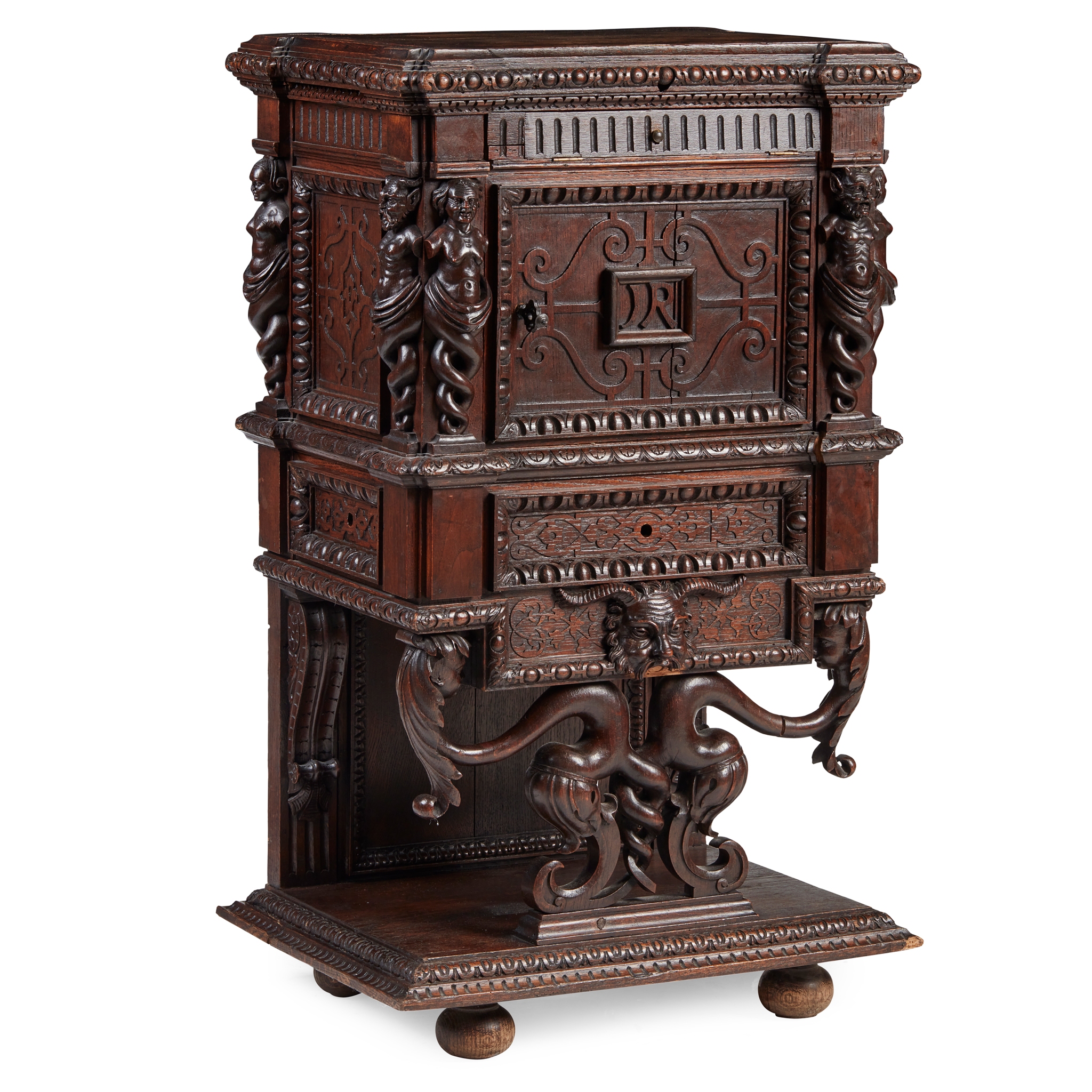 the hinged top opening to a shallow well with opposing slides and a swing-out shelf, above a cupboard door carved with strapwork and a centre panel with the initials JR, the corners with male and female terms, over a sliding bidet drawer to one side fitted with a metal liner, raised on scrolling supports and an undertier with bun feet