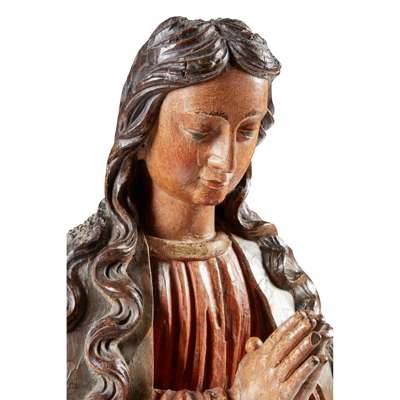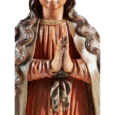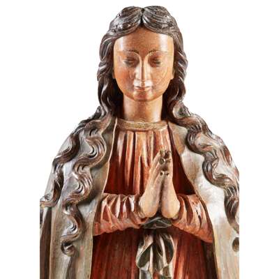the figure depicted standing with her hands in prayer, wearing a gathered red gown and blue mantle, her long hair hanging in wavy tresses