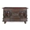 the hinged moulded top over a carved cushion frieze, the front with a central carved panel and four figures of musicians carved in high relief, on an inverted breakfront moulded base and stile feet