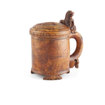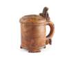 the slightly domed cover carved in low relief with a rampant lion amongst foliage, the incised handle with a stylised lion thumbpiece, on three carved foliate feet