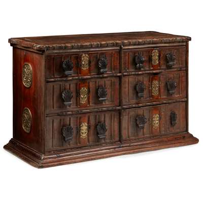 the panel top within a serpentine moulded border, over an arrangement of six short graduated drawers with fluted panel fronts mounted with ebonised shell form handles, the sides mounted with oval embossed brass plaques depicting exotic birds, on a projecting moulded base