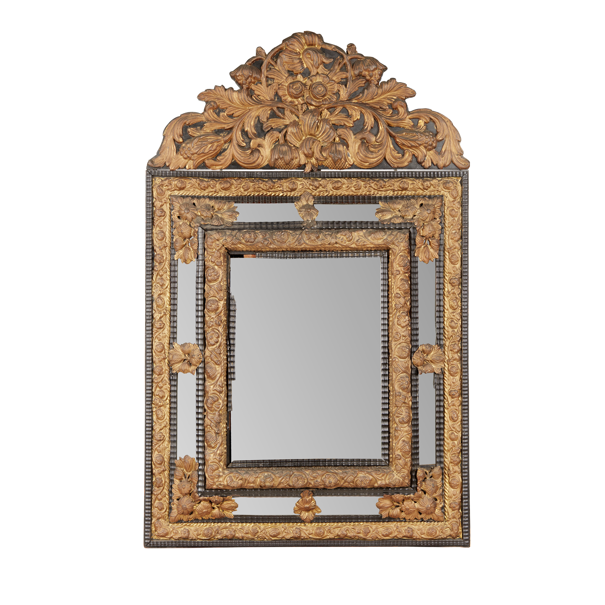 the arched cresting mounted with brass flowers and fruiting vines, above a rectangular bevelled mirror plate within embossed brass margin plates and ripple cut moulding