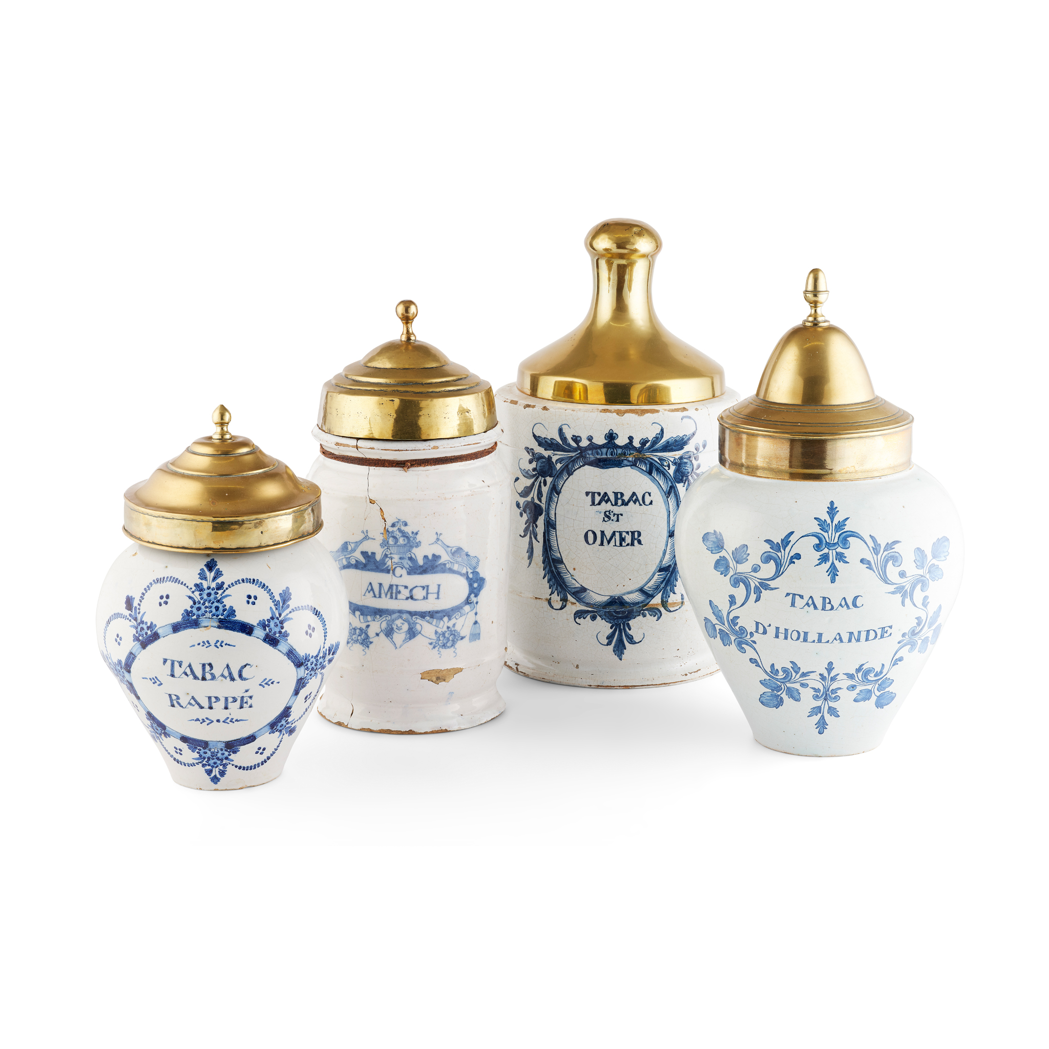one of cylindrical form with mask handles, inscribed ‘Tabac St Omer’ within a cartouche surmounted by a crown and with foliate decoration; another of cylindrical form, inscribed ‘C Amech’, within a cartouche surmounted with a head bearing a basket of fruits, flanked by two birds, above a winged putto; and two of baluster form, one inscribed ‘Tabac D’Hollande', the other inscribed ‘Tabac Rappe’, within foliate designs; each jar with an associated brass cover, unmarked (4)