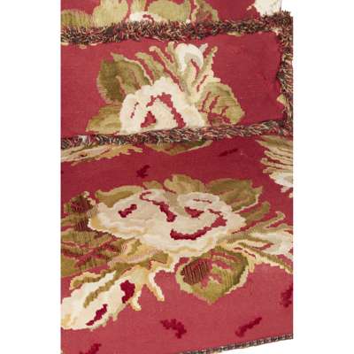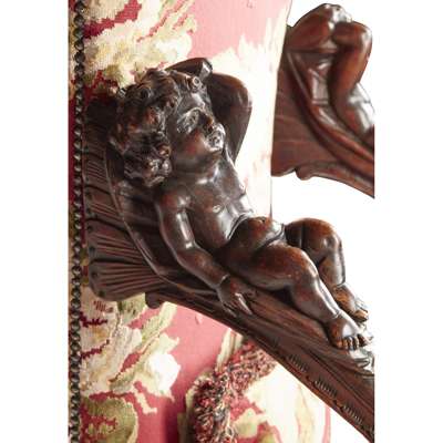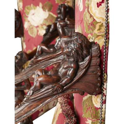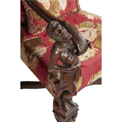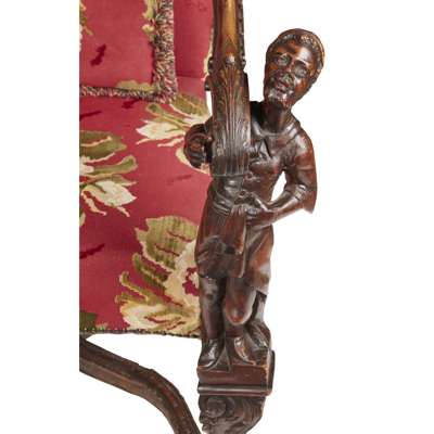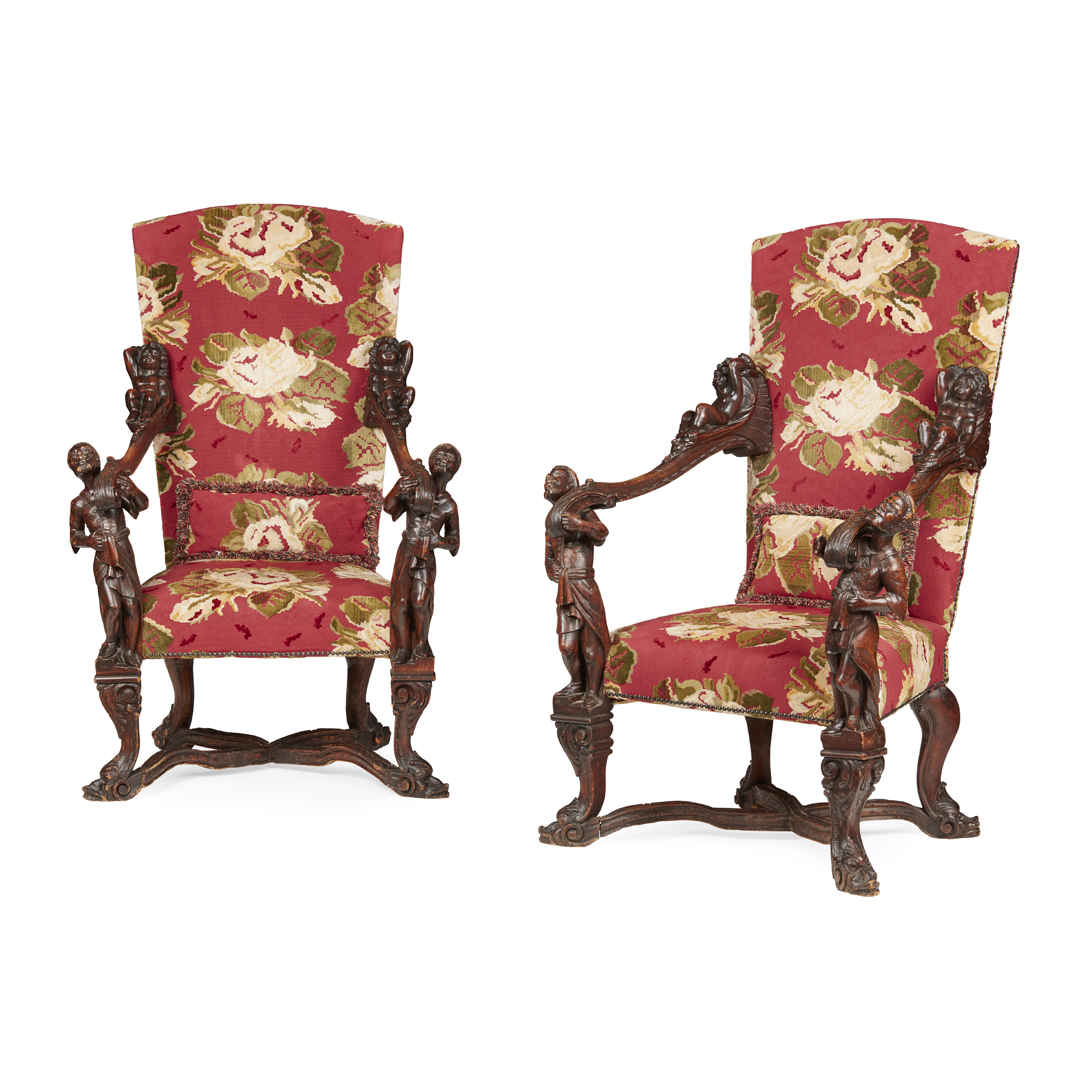 with tall upholstered backs and wide seats flanked by scrolled open arms carved with putti and supported by carved blackamoor figures, raised on foliate carved legs joined by X stretchers and ending in dolphin head feet (2)