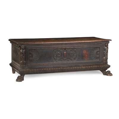 the hinged cover with a moulded edge above a front panel centred by a carved cartouche flanked by scrolls, shell motifs and terms, raised on bold paw feet