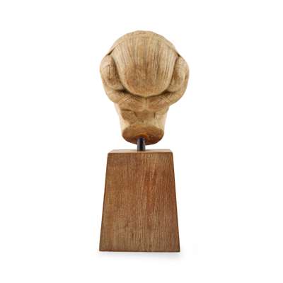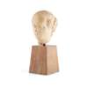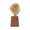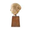 modelled in the Mannerist style with downcast almond eyes, high forehead and plaited hair set with ribbons, mounted on a limed oak veneered tapering square plinth, head 18cm high