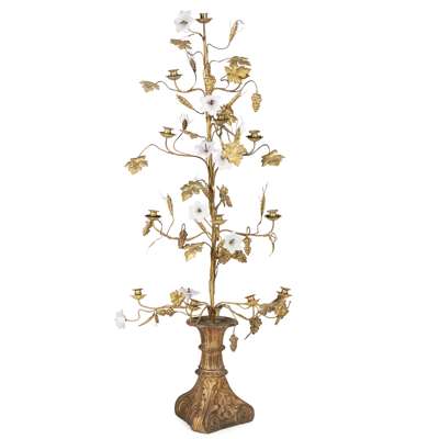 with grape vines and clusters, wheat sheafs, and white glass lilies, and thirteen candle branches, on a baroque triform base