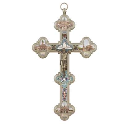 the four points of the cross with quatrefoil mosaic scenes of the four major basilicas of Rome: St. Peter's, St. Mary Major, St. John Lateran, and St. Paul Outside the Walls; the centre with a cast figure of Christ with a quatrefoil mosaic dove and cypher, suspended from a loop