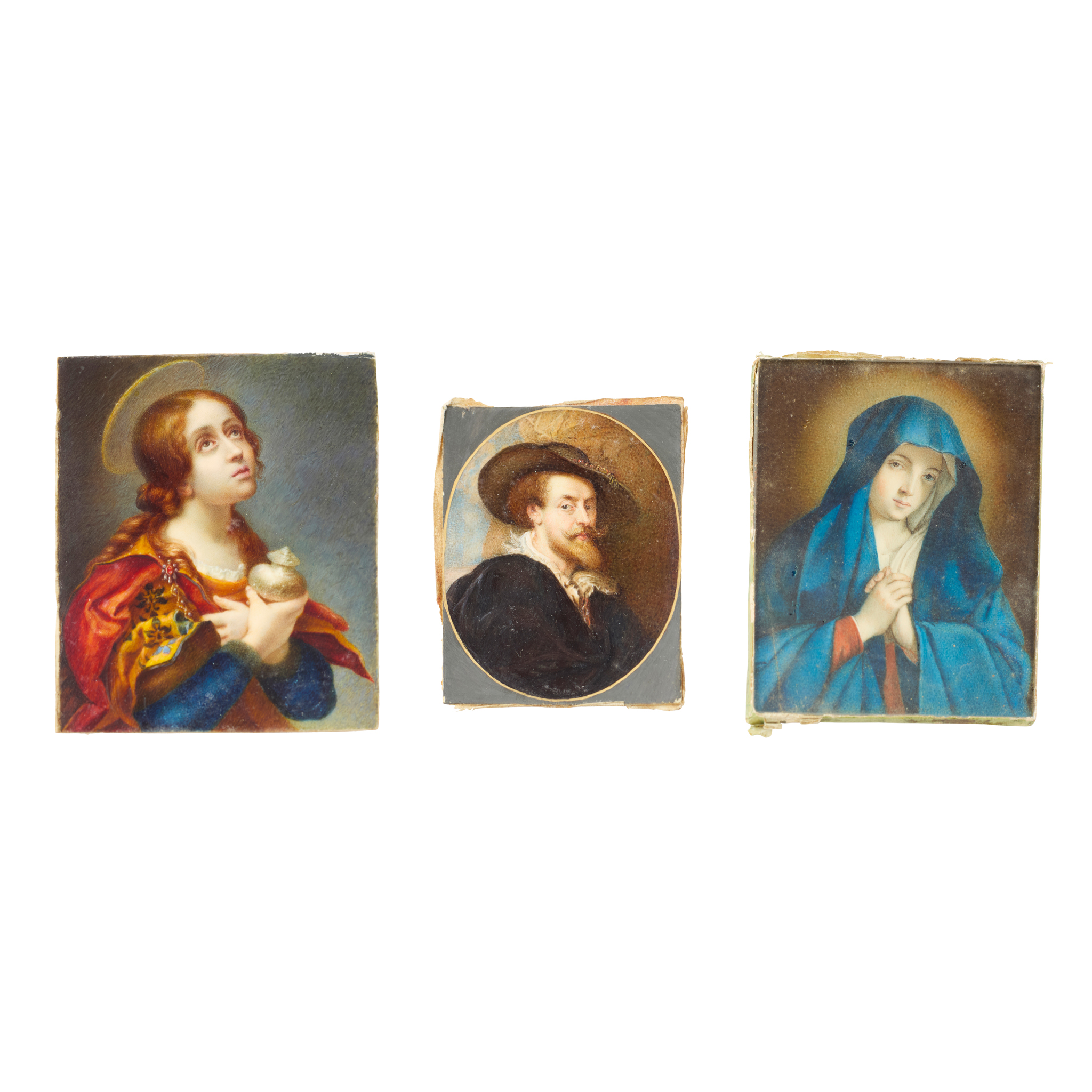 to include an oval self portrait of Rubens, gouache on card, 7.2cm x 5.8cm; Mary Magdalene after Carlo Dolce, watercolour on card, 9.5cm x 7cm; Madonna in Sorrow after Sassoferrato, watercolour on vellum mounted under glass, 9cm x 7cm (3)