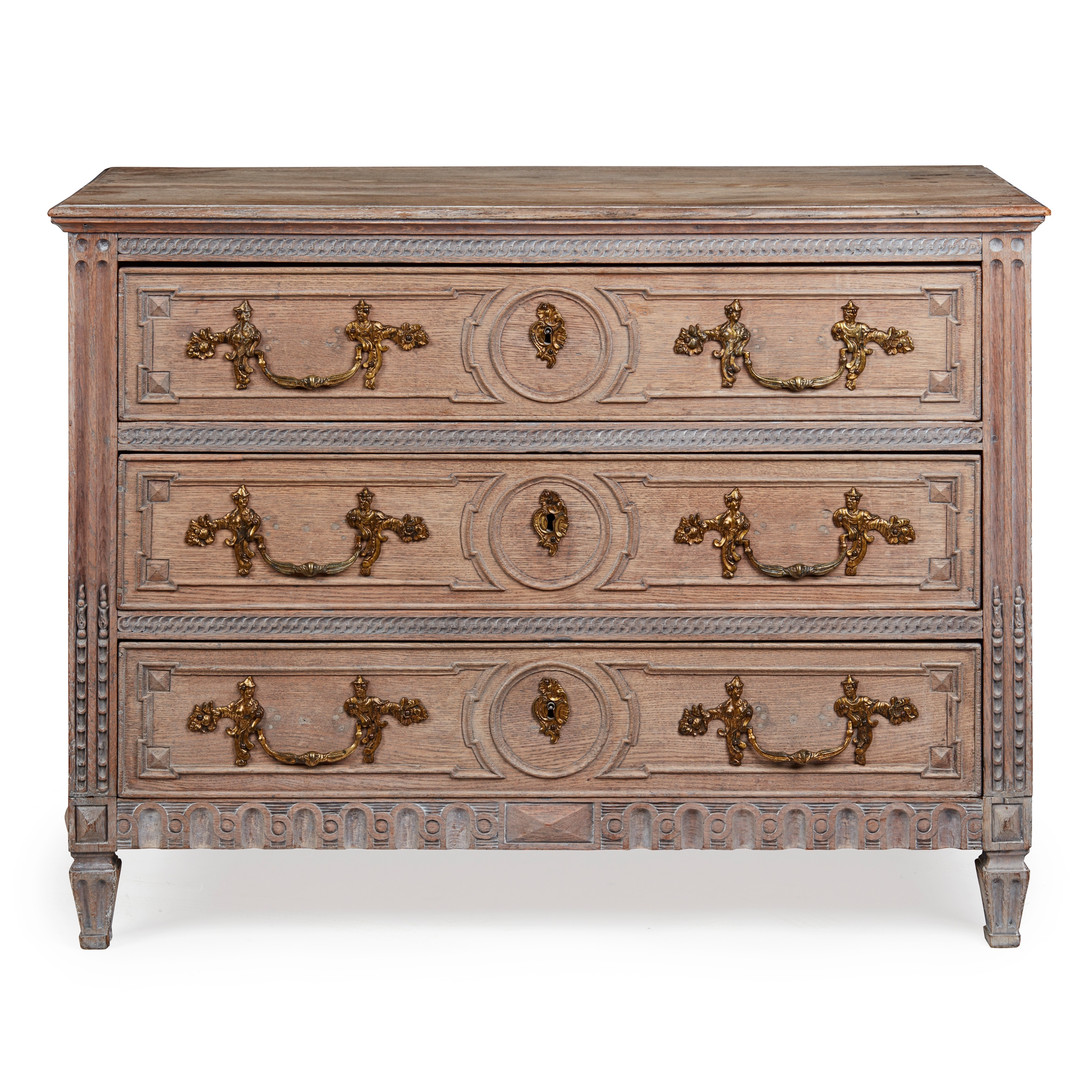 the top with a moulded edge above a key and guilloche moulded frieze, over three long drawers outlined with moulding and marked at the corners with lozenges, with figural chinoiserie gilt metal handles and escutcheons, raised on short square tapering fluted legs
