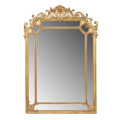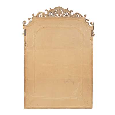 the shaped rectangular bevelled mirror plate in a bead moulded frame enclosed by margin plates and surmounted by C and foliate scroll cresting with a pierced lattice and shell pediment