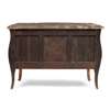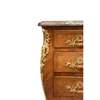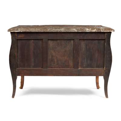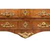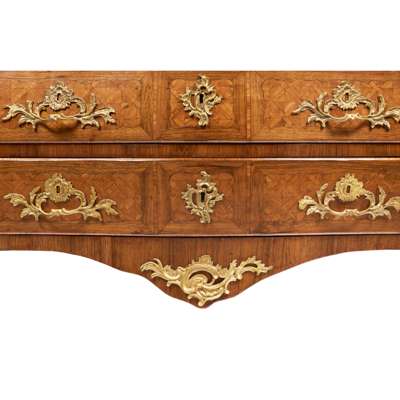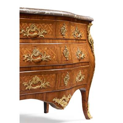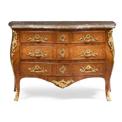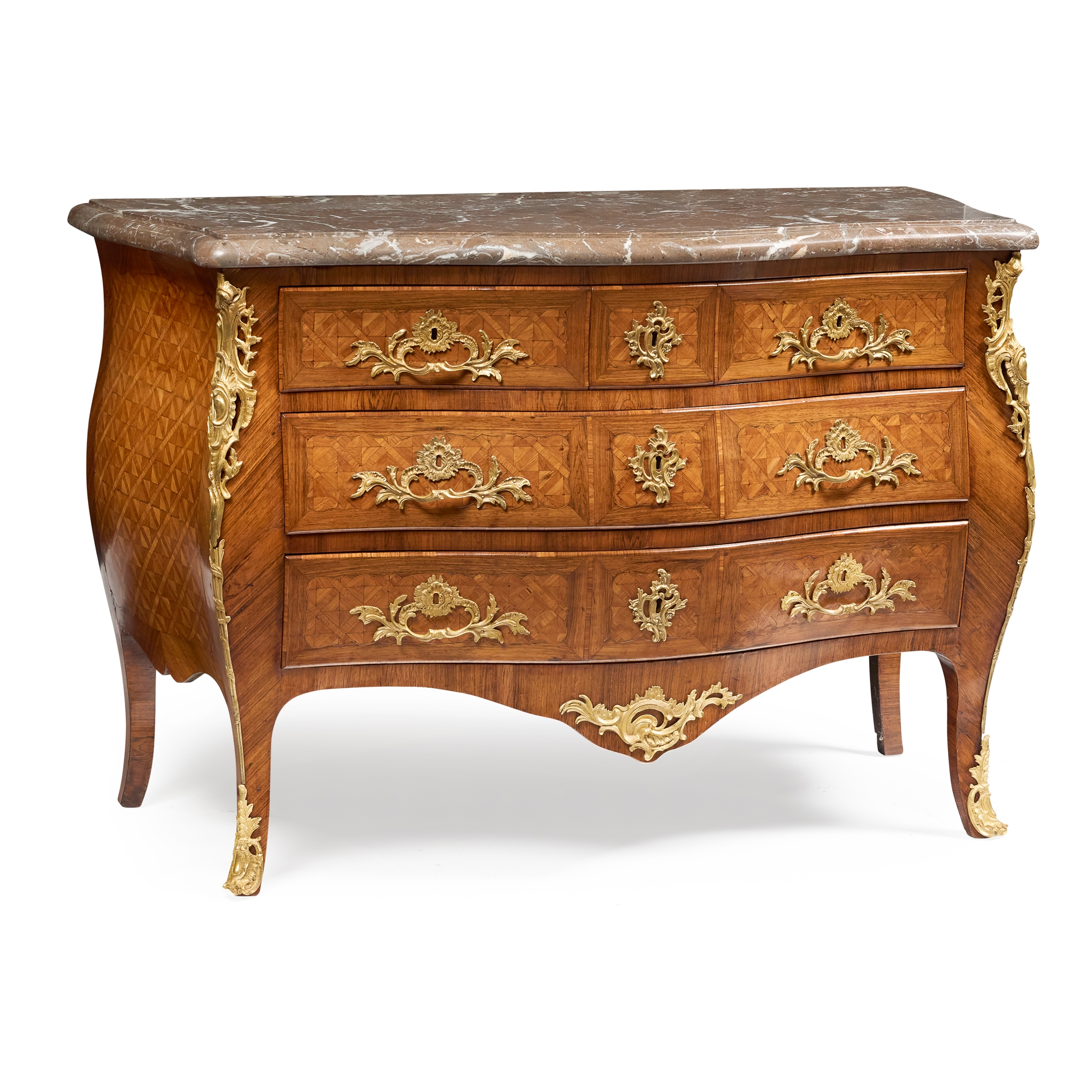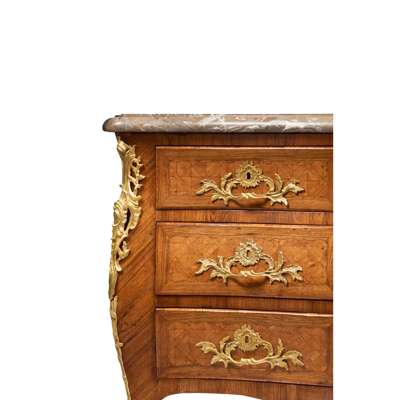 the serpentine veined grey marble top with a moulded edge above three long crossbanded drawers with parquetry reserves, mounted with ormolu foliate handles and escutcheons, above a shaped apron centred by a further foliate mount, flanked by angles outlined with rococo ormolu mounts and continuing to slender splayed legs with sabots