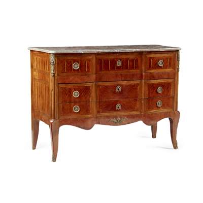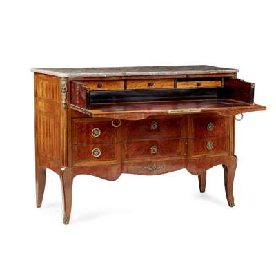 FRENCH TRANSITIONAL STYLE KINGWOOD PARQUETRY SECRETAIRE COMMODE, BY JOSEPH ROLL