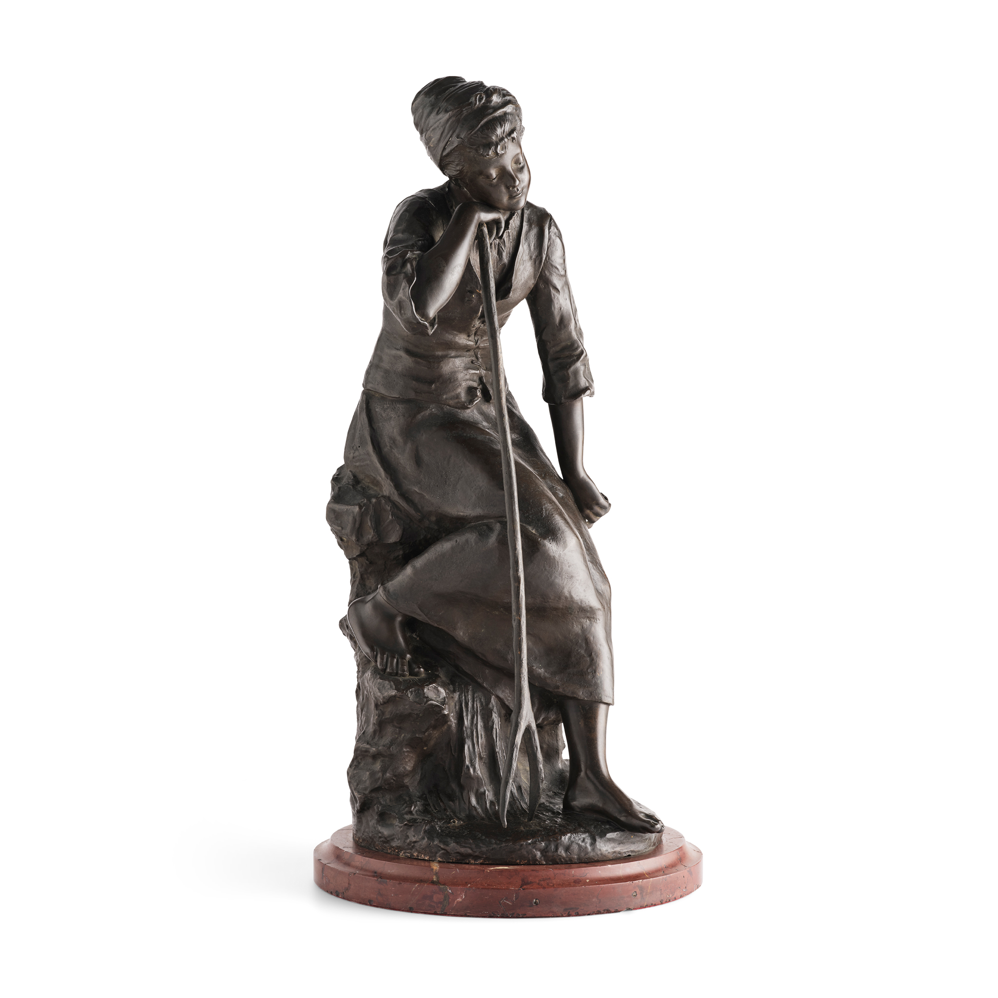 medium brown patina, the figure modelled barefoot and seated resting against a pitchfork, signed ‘Stanniers [?]’, on a rouge marble circular base