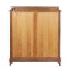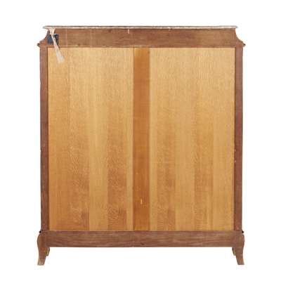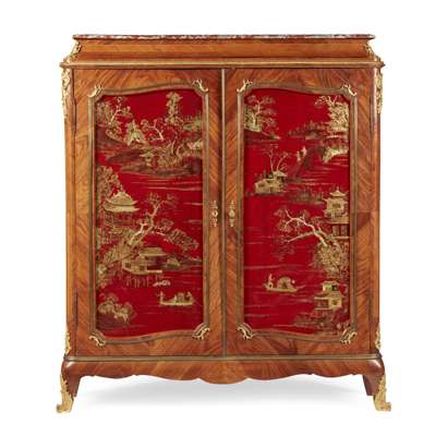 the brêche marble top with a moulded edge above a pair of crossbanded doors centred with chinoiserie red lacquer panels depicting pavilions, pagodas, and riverside landscapes, on cabriole legs with foliate cast gilt metal mounts