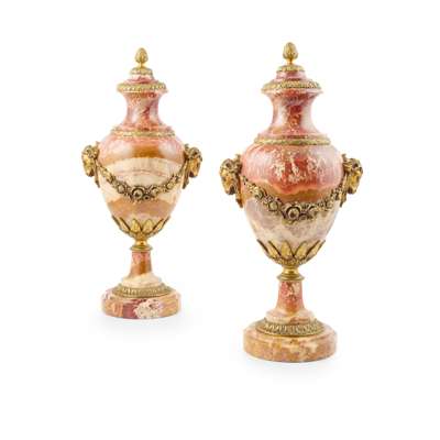 PAIR OF LOUIS XVI STYLE GILT BRONZE MOUNTED RED JASPER URNS