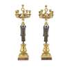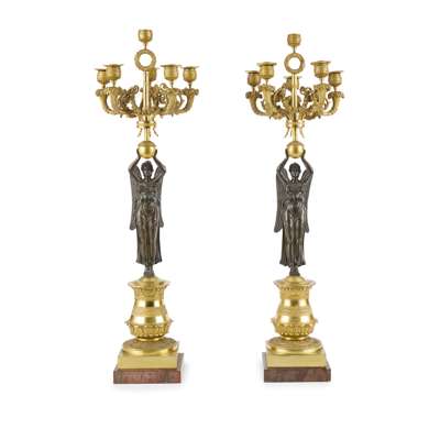 PAIR OF EMPIRE STYLE GILT AND PATINATED BRONZE FIGURAL CANDELABRA, IN THE MANNER OF PIERRE-PHILIPPE THOMIRE