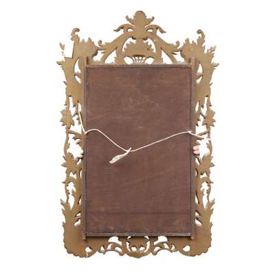 the shaped oval mirror plate in a pierced rococo frame carved with C and leaf scrolls surmounted by a leaf cresting centred by a flowering basket