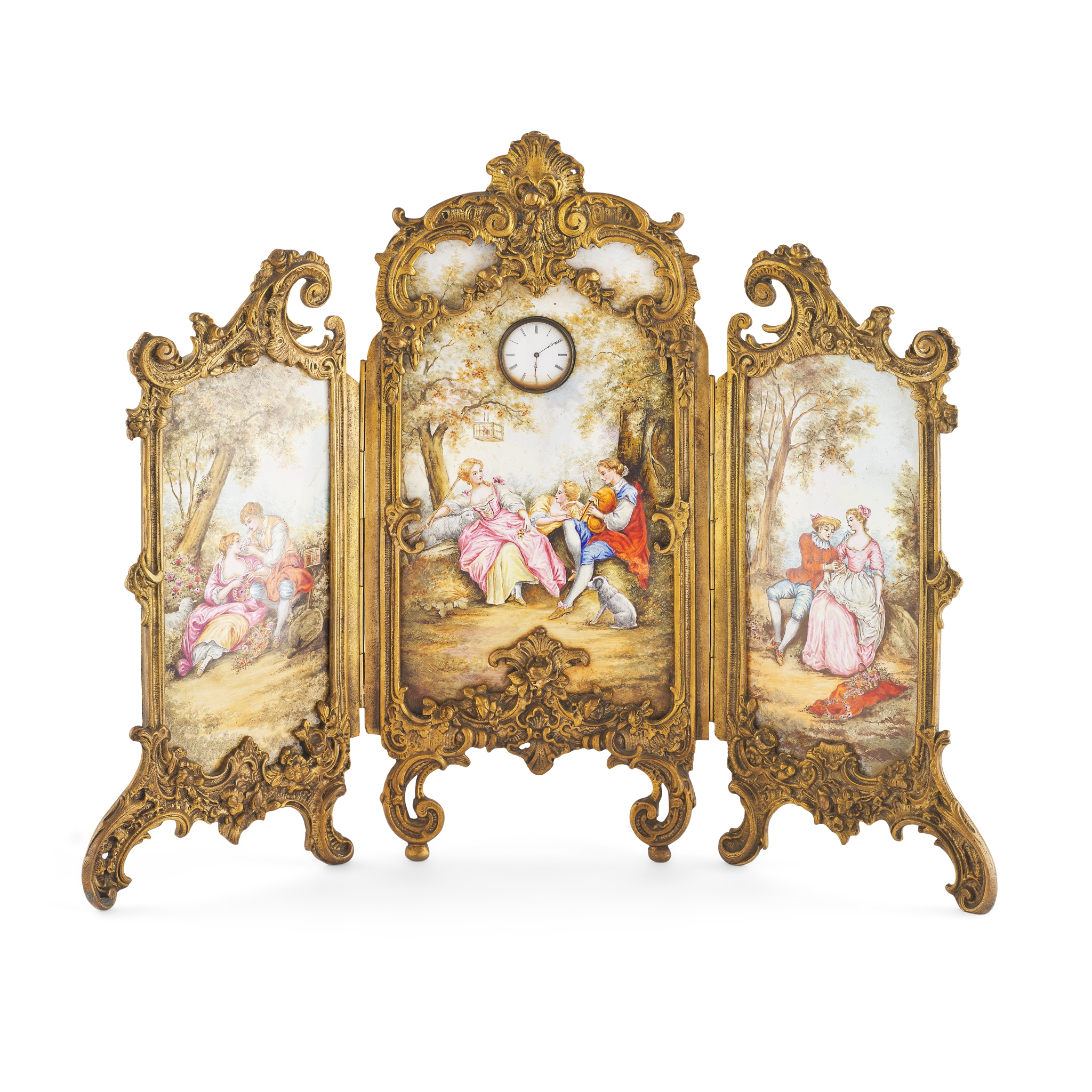 AUSTRIAN ENAMEL AND GILT METAL TIMEPIECE TABLE SCREEN