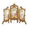 each panel painted with a scene of courting couples, in a gilt metal rococo style frame, the centre panel fitted with a timepiece mechanism with Roman numerals