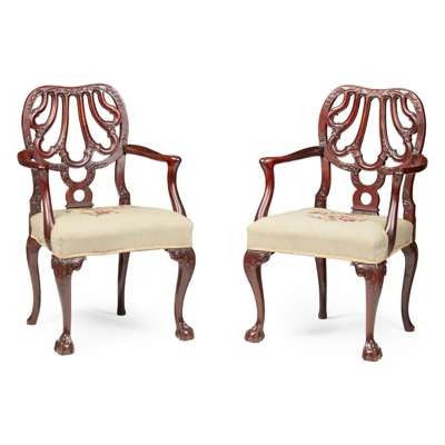 Note: This set of chairs with their distinctive shell backs are modelled after a famous set believed to have been supplied by Giles Grendey for Henry Hoare at Stourhead, Wiltshire and illustrated in R. Macquoid and R. Edwards, The Dictionary of English Furniture, 1954, vol. I, p.275, fig. 154. Robert Strahan & Co. gained the reputation for producing high quality furniture and were commissioned to design and manufacture for some of the great Irish country houses. The firm began trading in the 18th century, expanding through the 19th century and continued until 1969.