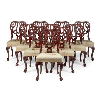 SET OF TWELVE GEORGE II STYLE CARVED MAHOGANY DINING CHAIRS, TO A DESIGN BY GILES GRENDEY, BY R. STRAHAN, DUBLIN