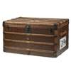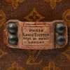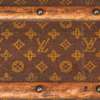 monogramed canvas exterior, with stamped leather handles, brass lock and catches, brass corners and stamped studded battens to lid, front and rear, roller wheels to underside, painted white initials ‘PM’ to the lid, opening to a cream cloth interior with diamond grosgrain ribbon studded lid and a single lift out tray with three straps, a leather label to the back of the lid '1 Rue Scribe, Paris, Louis Vuitton, 149 New Bond Street, London…' with stamped black ink serial number '207898'