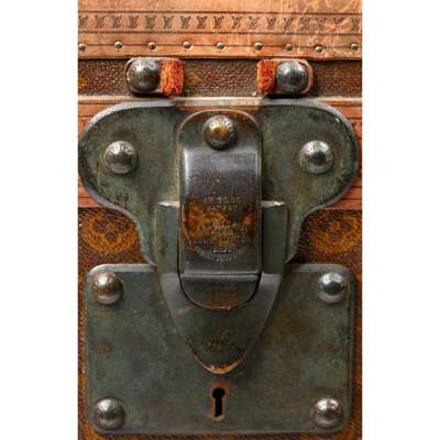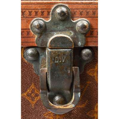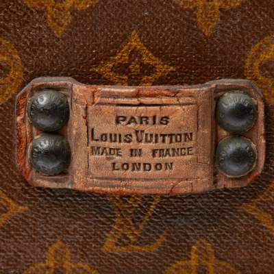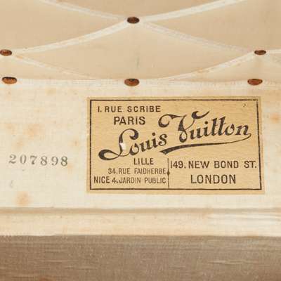 monogramed canvas exterior, with stamped leather handles, brass lock and catches, brass corners and stamped studded battens to lid, front and rear, roller wheels to underside, painted white initials ‘PM’ to the lid, opening to a cream cloth interior with diamond grosgrain ribbon studded lid and a single lift out tray with three straps, a leather label to the back of the lid '1 Rue Scribe, Paris, Louis Vuitton, 149 New Bond Street, London…' with stamped black ink serial number '207898'