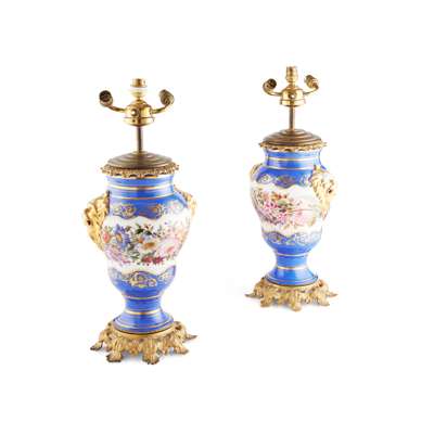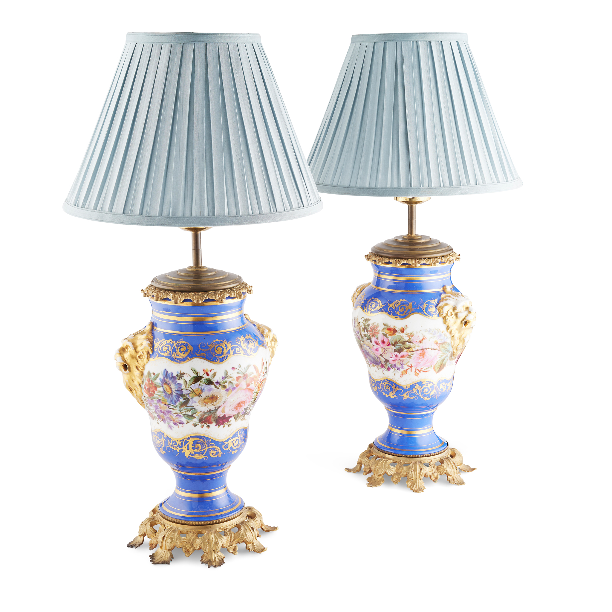 of baluster form, moulded with lion mask handles, painted with a central band of mixed flowers, on a blue ground decorated with gilt foliate scrolls and blue lines, with pierced gilt metal mounts of leaf and flower form, with blue pleated shades (2)