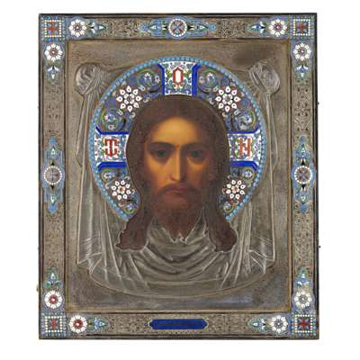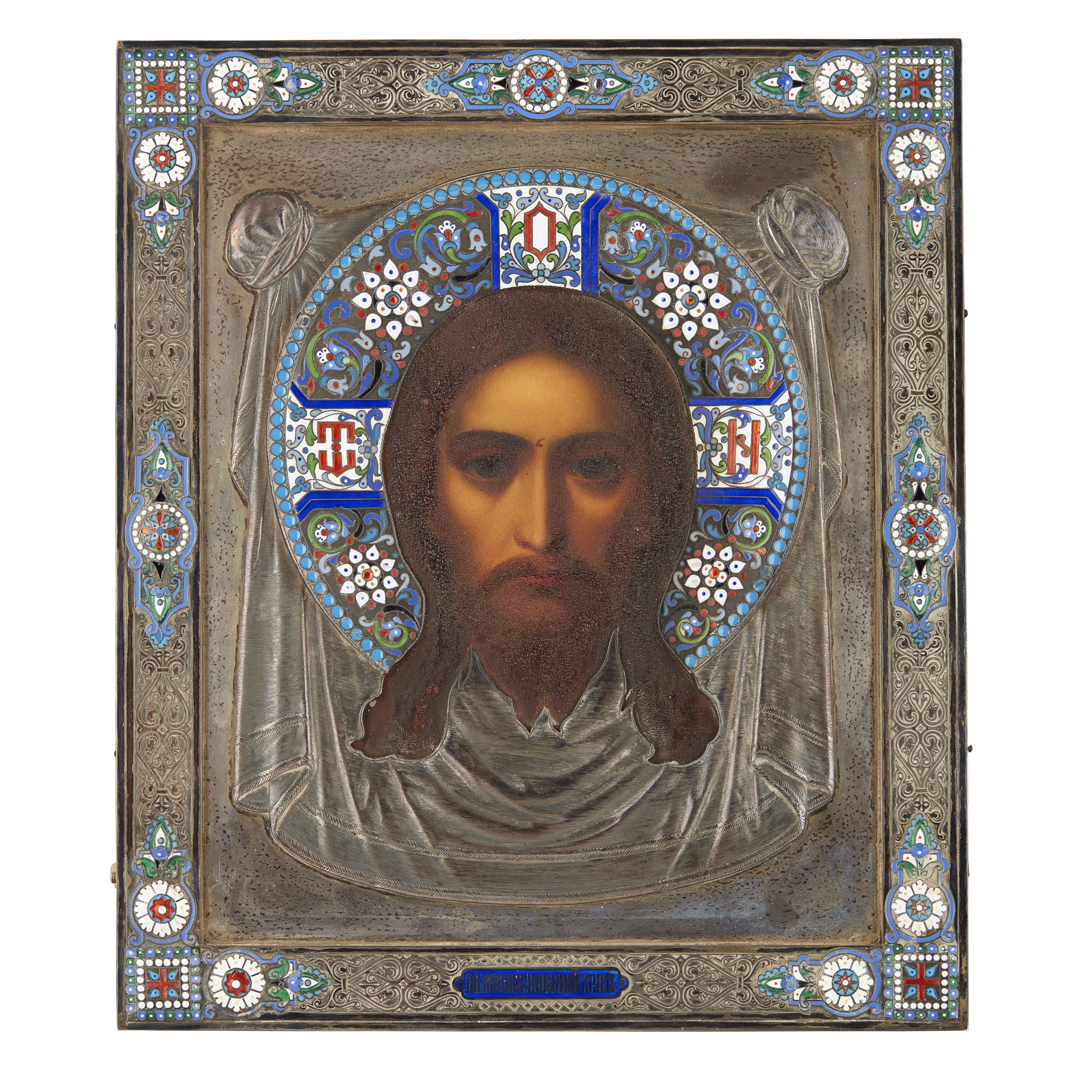 painted panel mounted in an embossed and a chased silver oklad with cloisonné halo, within a raised border with enamel strapwork, the oklad struck to the lower edge of the frame with makers mark in Cyrillic, the double headed eagle mark of the Imperial Court silversmith cypher and a Moscow assay mark dated 1893 for assayer Anatoliì Apollonovich Artsybashev, with a brown velvet backing