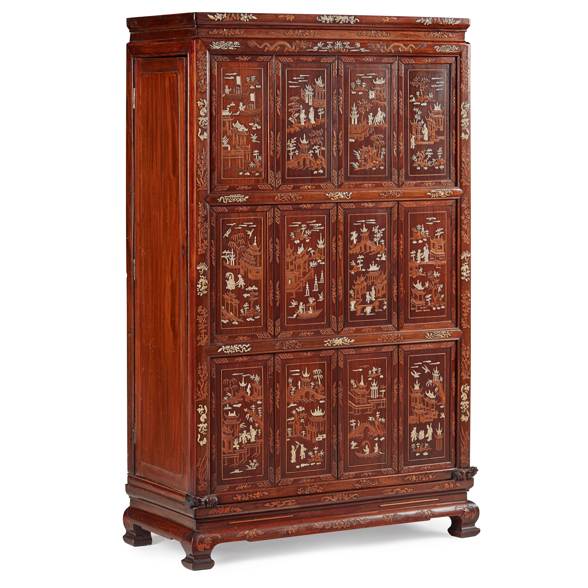 the cornice above an arrangement of sixteen panels inlaid with scenes of scholars, courtiers, and imperial figures in landscapes with pagodas, gardens and pavilions, the frame with tree shrews, dragons, butterflies and scholars' objects interspersed with lotus, bamboo, and prunus blossoms, the plain side panels opening to shelved void interiors, raised on ogee feet
