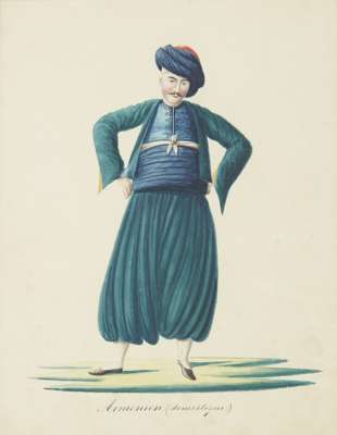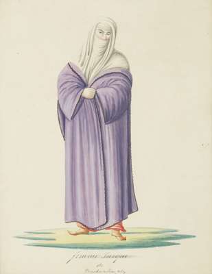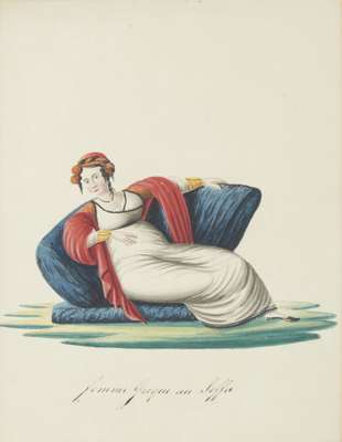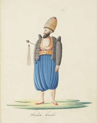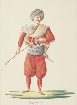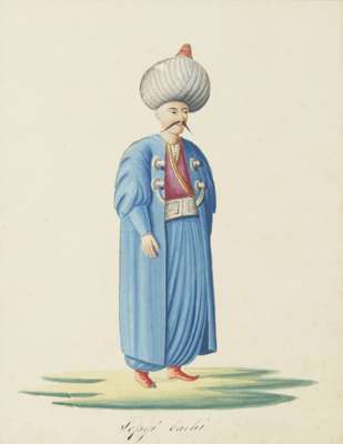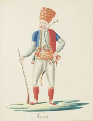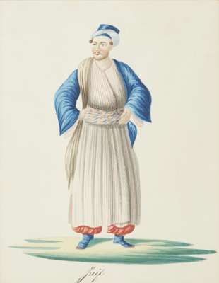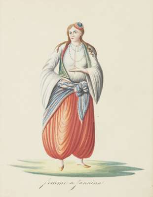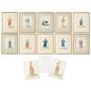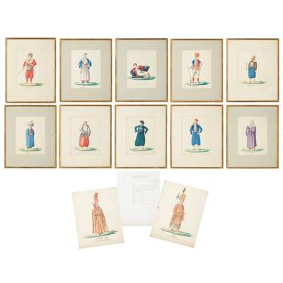 in the manner of Jean Baptiste Vanmour or Van Mour, depicting male and female figures in the dress of the Ottoman Empire and Levant, identified in script beneath each figure, mounted in gilt frames; together with two loose unframed examples (12)