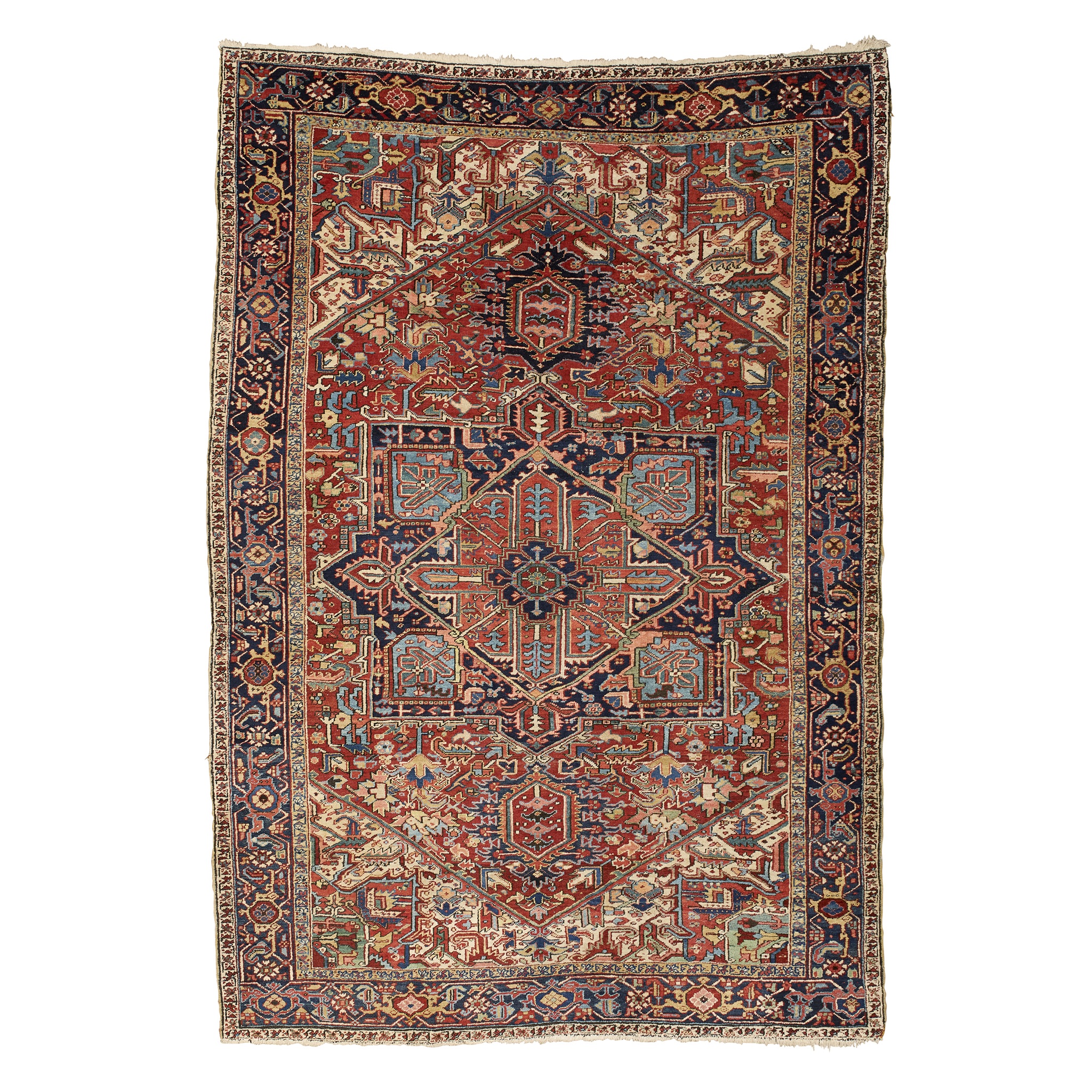 the red field with large indigo and red star medallion, ivory spandrels, within indigo border
