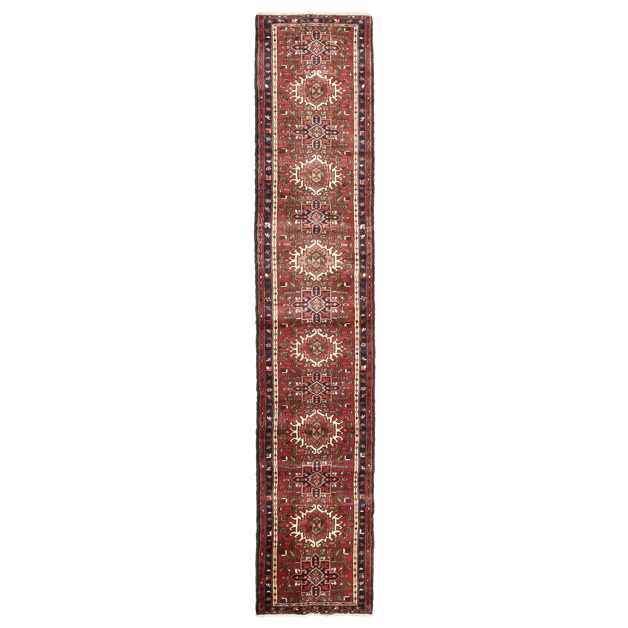 the brownish red field with column of medallions, within narrow indigo border