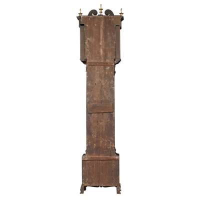 the 11 inch brass dial with silvered chapter with Roman numerals and Arabic five minute markers, subsidiary seconds dial and date aperture, pierced gilt spandrels, signed on a silvered roundel to the arch ‘Robert Coats, Hamilton’ flanked by pierced dolphins, the hood with broken swan neck pediment, pierced lattice panels, rosette roundels surmounted by a three gilt urn finials, the dial flanked by free fluted Doric columns and pierced fret panels to the sides, the case with a Chinoiserie fretwork frieze above a shaped arch trunk door flanked by ebonised fluted quarter columns with gilt bronze Corinthian capitals, on a moulded panel base with ogee bracket feet, the twin train movement striking a bell
