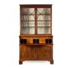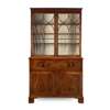 the key moulded cornice above a lancet moulded frieze and a pair of astragal glazed doors enclosing adjustable shelves; the lower part with a fall-front secretaire drawer fitted with pigeon holes and drawers, over a pair of moulded cupboard doors, raised on shaped bracket feet
